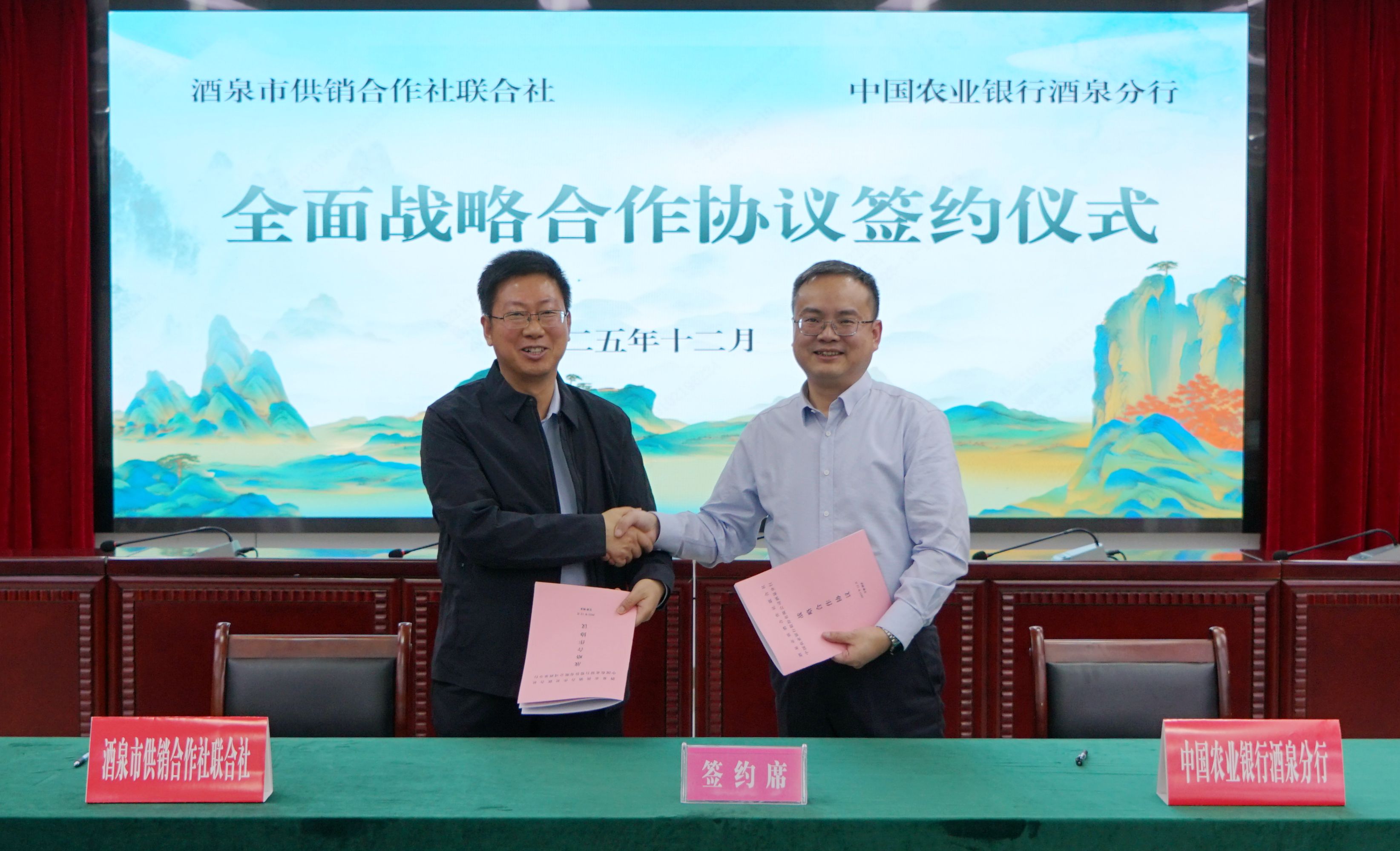 农村金融时报网-甘肃讯(记者 郝飞 通讯员 姚东兆)近日,农业银行酒泉分行与酒泉市供销社举行战略合作签约仪式,双方主要负责人出席并见证签约。根据协议,双方将充分发挥各自优势,共同助推乡村振兴,重点围绕县域流通服务网络建设与农村金融服务等领域,开展全方位、深层次、多元化合作,携手服务酒泉市农村经济社会高质量发展。