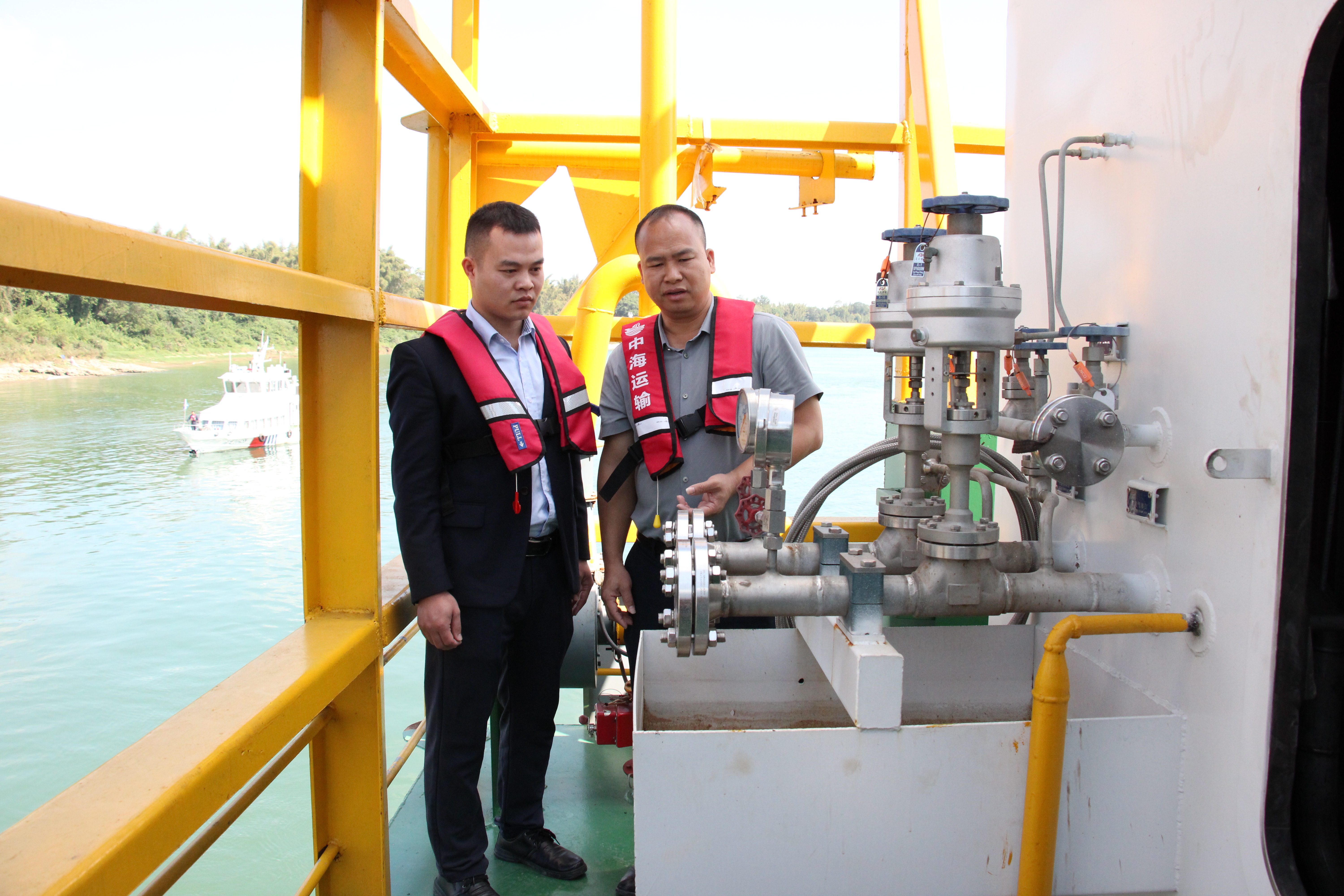 桂平市中海运输有限责任公司负责人向邮储银行贵港市分行客户经理介绍LNG新能源船舶相关情况 韦安源/摄