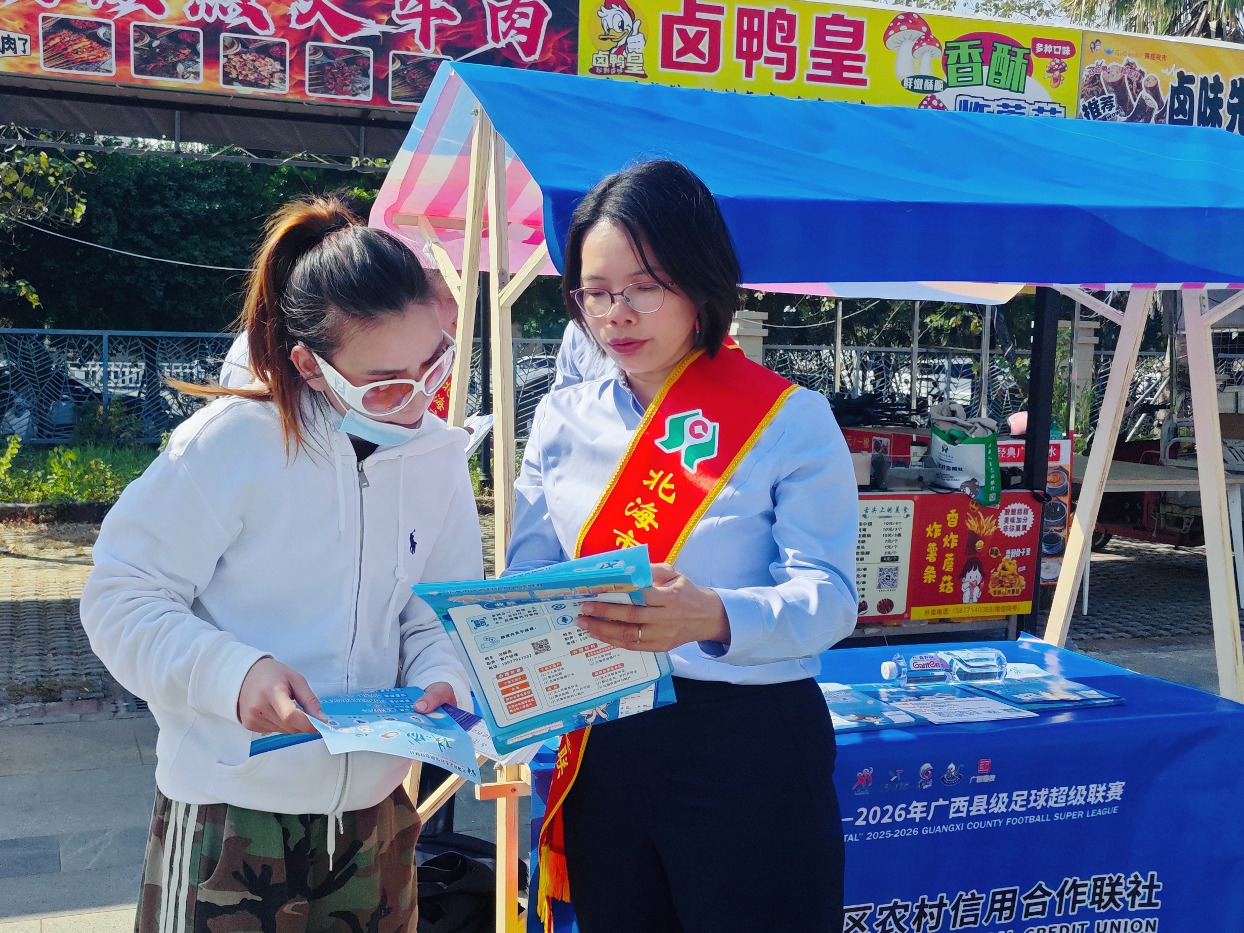 赛场下,北海市区联社设置了金融服务点,工作人员热情地向观众发放宣传资料,详细介绍“珠城e贷”“易农贷”“消费贷”等特色金融产品,以及社保卡服务、数字金融等便民服务。许多市民驻足咨询,工作人员耐心解答,让金融服务走出营业网点,来到群众身边,将专业的金融支持融入热烈的赛事氛围中。