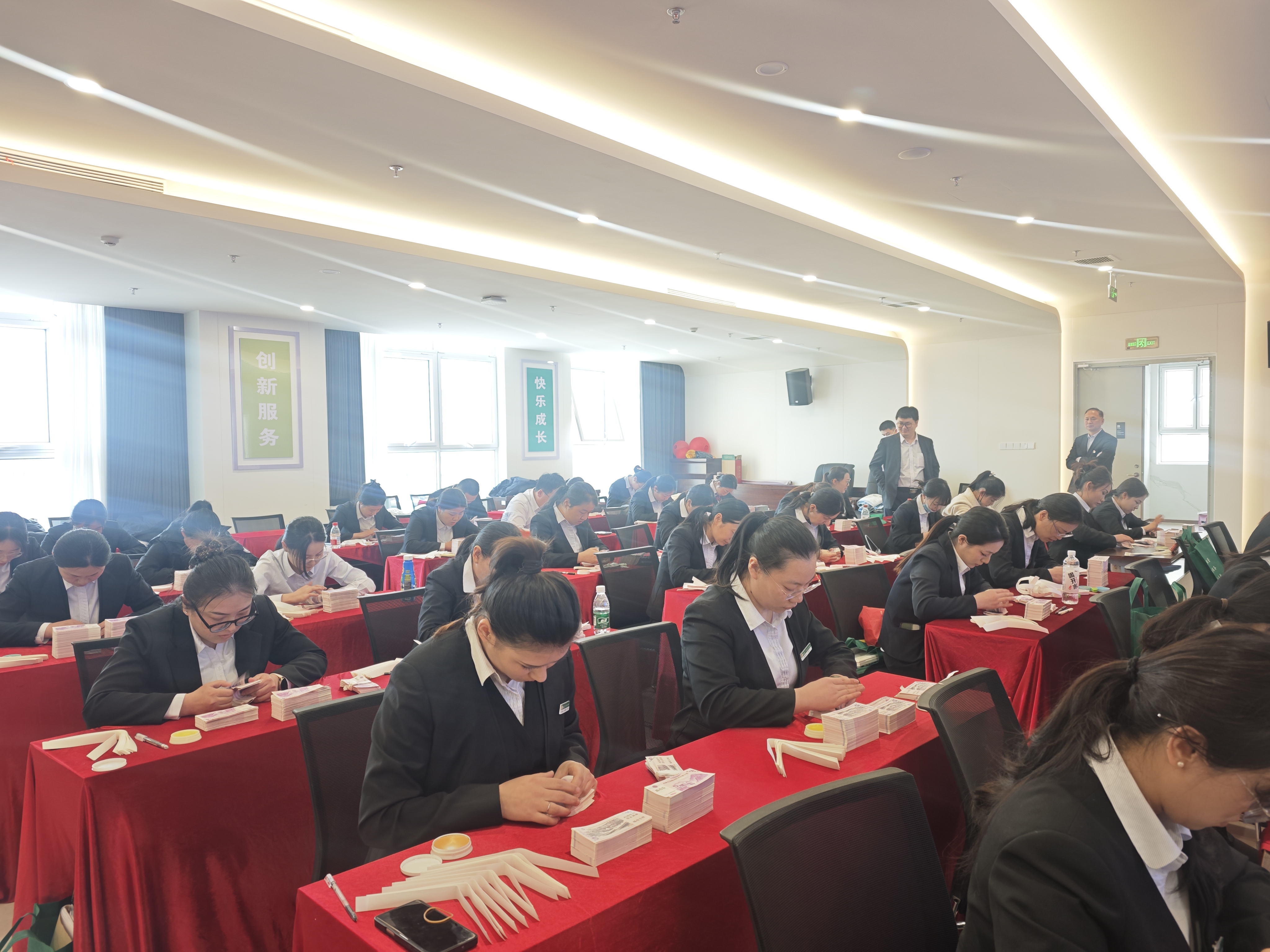 业务技能实操考核紧扣柜面服务实战需求,以“速度与精准并存、专业与高效共生”为评价标准,围绕汉字录入、数字键盘录入、手工点钞三大核心技能展开全方位考评。考核现场氛围感拉满:指尖在键盘上飞速跳跃,精准敲击每一组数字;点钞机旁手法娴熟,指尖翻飞间完成精准计数,每一个利落的操作,都凝聚着平日千百次的刻苦训练;每一项优异的成绩,都彰显着伊犁国民村镇银行柜面人员“召之即来、来之能战”的过硬本领,生动诠释了“专业源于深耕”的职业信仰。
