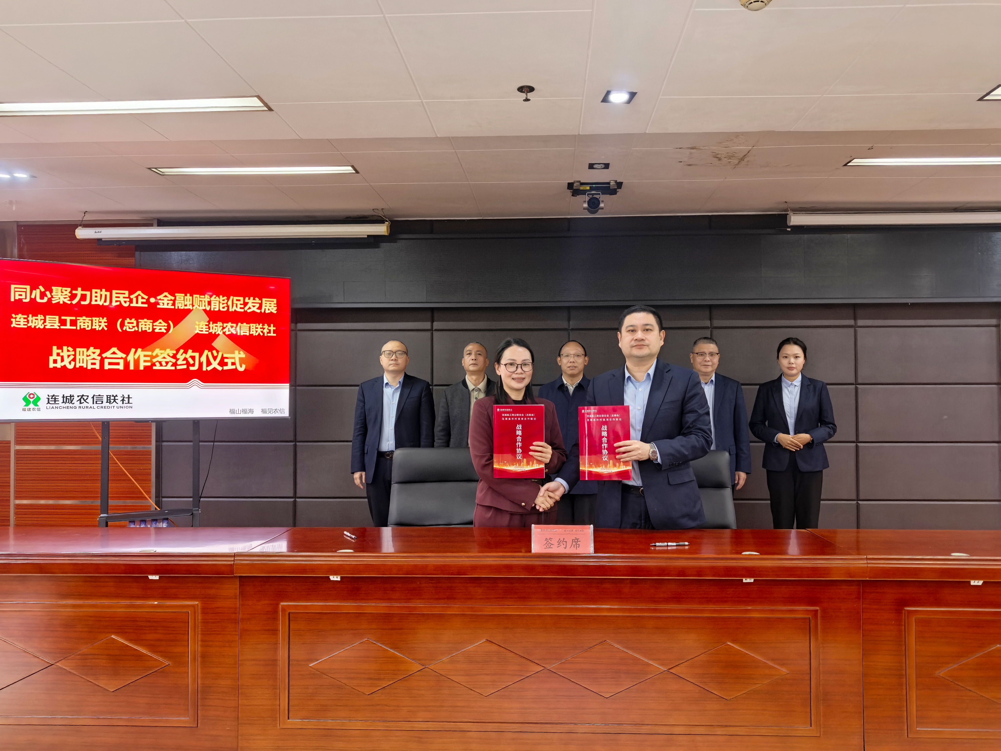农村金融时报网-福建讯(记者 陈衍水)3月13日,连城农信联社与连城县工商联(总商会)举办战略合作签约仪式。县委常委、统战部部长李镇祥,连城农信联社党委书记、理事长邹树辉,县工商联主席(总商会会长)曹小清、副主席罗家辉,连城农信联社领导班子成员及各直属商协会代表等相关人员参加签约仪式。