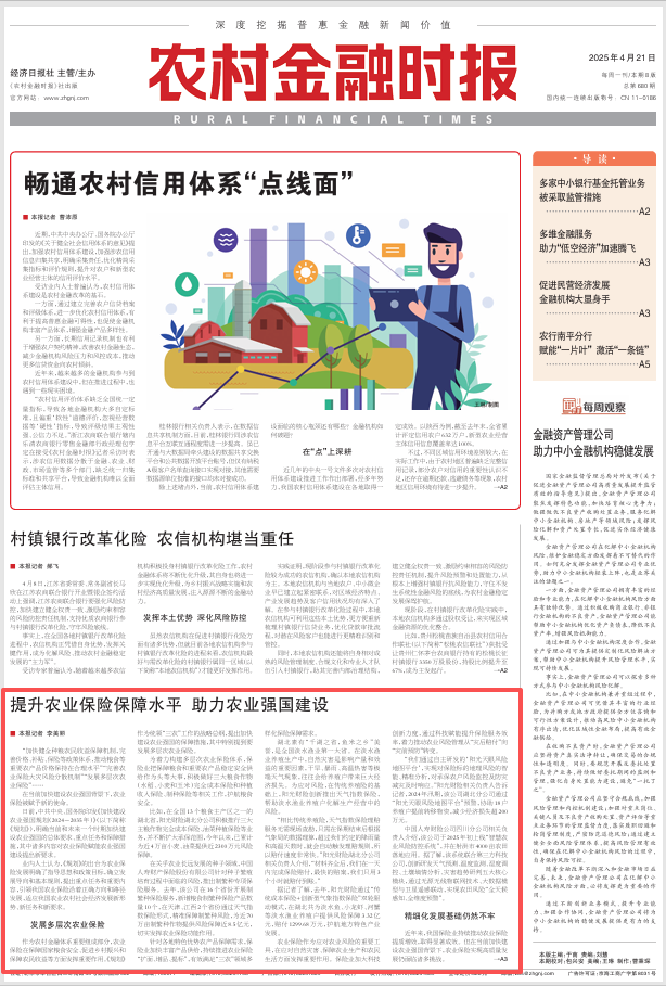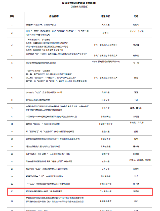 4月27日,中国保险行业协会发布“保险业2025年度十件大事”和“保险业2025年度新闻”。《农村金融时报》2025年4月21日A1、A3版面刊发的报道《提升农业保险保障水平 助力农业强国建设》入选“保险业2025年度新闻”。