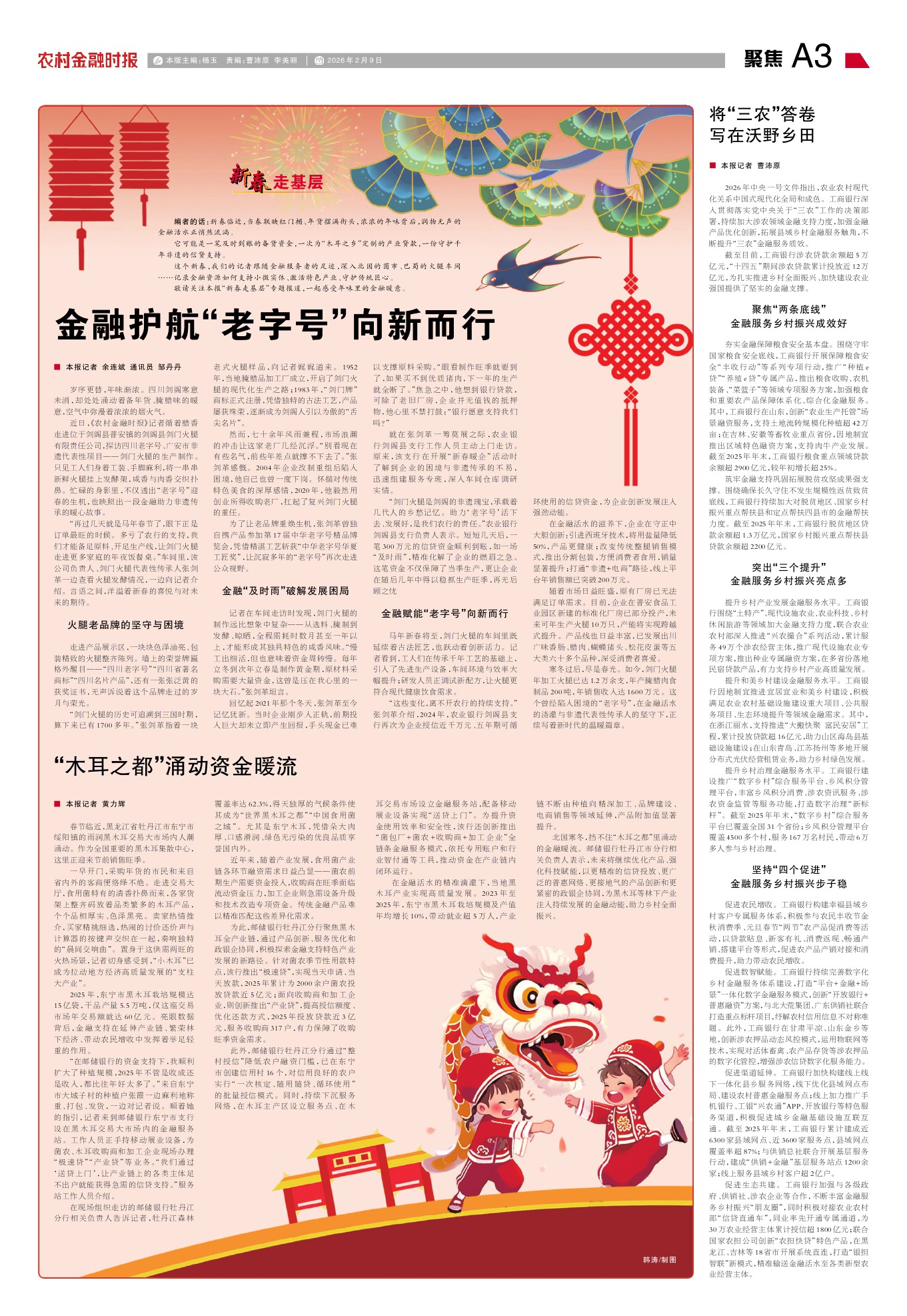 2026年中央一号文件指出,农业农村现代化关系中国式现代化全局和成色。工商银行深入贯彻落实党中央关于“三农”工作的决策部署,持续加大涉农领域金融支持力度,加强金融产品优化创新,拓展县域乡村金融服务触角,不断提升“三农”金融服务质效。